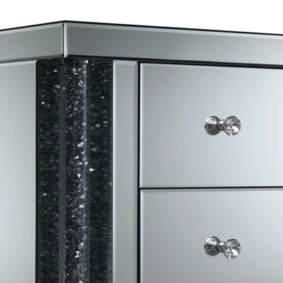 Dress for success in a transitional bedroom or main living space in search of the perfect glam personality. Silver creates a compelling finish with wonderful versatility and a sense of upscale artistry. The Allen Mirrored Three-Drawer Side Table sparkles and catches light brilliantly. The mix of mirrored panels, jewel-like acrylic accents, and clear tempered glass turn up the style wattage on this gorgeous accent table. Use as a bedroom nightstand or anchor next to a stylish sofa for extra display space.