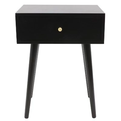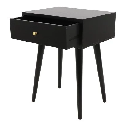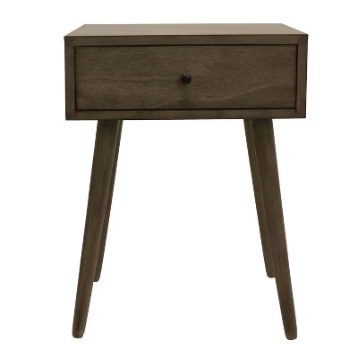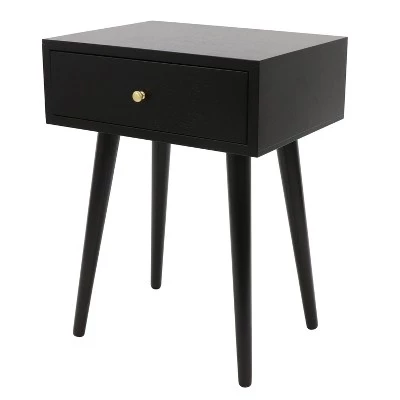 If you are looking for an affordable way to modernize your home with mid-century flair, look no further, this side table storage accent table will fill the bill! This uniquely designed side table encompasses mid-century modern design by exuding clean lines, a stylish finish, and simple round hardware. Features include hardwood solids and veneer construction, one storage drawer, and tapered legs. This product is extremely versatile and can be utilized as a side table, or accent table. Size: 17.75w 13.75d 23.5h Manufactured in China. Ships Small Parcel. Assembly Required.