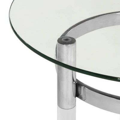 This round glass end table is an aesthetic pairing of iconic Bauhaus style and decadent vintage Italian design. A modern heirloom for any living room, itβs crafted with smooth glass and sleek acrylic. Designers love its polished stainless steel finish. The cool mod design and bright elegant details of this end table makes it a perfect addition for contemporary, modern, or transitional rooms. Its clear glass top makes it perfect for a vase full of flowers or a stack of books.