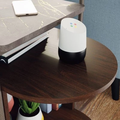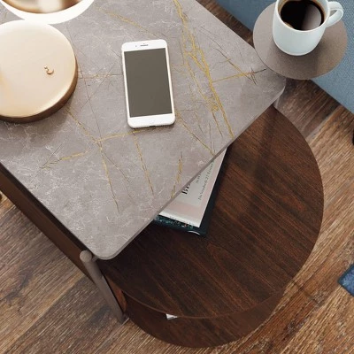 Side tables don’t need to be the side attraction in your living room. Turn heads with this modern side table from the Radialยฎ collection. Featuring open shelving for storage and display, the many levels of this modern side table with storage holds remotes, magazines, books, or small organizing bins. The coaster shelf pivots and can be position on either side of the front leg frame so your drink is never far away. This modern end table is finished on all sides so no matter what angle you view it from, it looks fantastic. A textured, powder coated metal frame, an Umber Woodโข finish with faux Deco Stone top surface accent finish, completes the modern glam of this stone top end table. With a blend of shapes and textures, this modern end table refuses to take the back seat in your home.