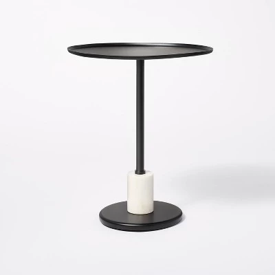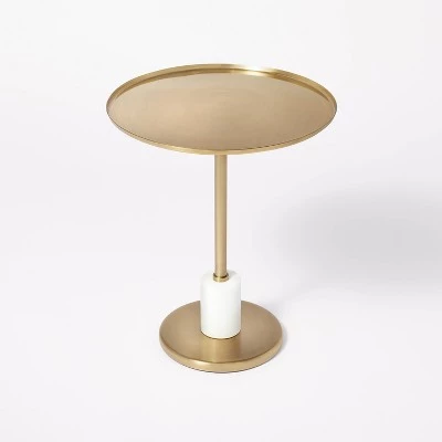 Create a stunning look in your home by adding this Fielding Pedestal Accent Table from Threshold™ designed with Studio McGee. Set atop a round pedestal base accented with a white cylindrical stone, this side table lends modern appeal to your decor. Made with metal for sleek style, this round end table comes with raised sides to help you display floral arrangements, decorative sculpture and more. Simply style it alongside your sofa or in any other space to add a perfect finishing touch to your decor.