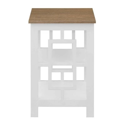 Reinvent your living room with the Town Square End Table with Shelves by Breighton Home. This simple yet eye-catching end table showcases an Asian-inspired design with its unique square side panels. Two additional shelves provide convenient storage or display space to meet oneβs entertainment and storage needs. This carefully crafted unit is constructed from MDF and finished with non-lead-based paint for safe, long-term use. Coordinate this end table with additional pieces from the Town Square Collection by Breighton Home, each sold separately.