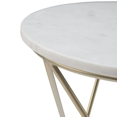 - Features marble reinforced with wood substrate to create a durable long lasting top, gold metal frame and hairpin legs