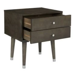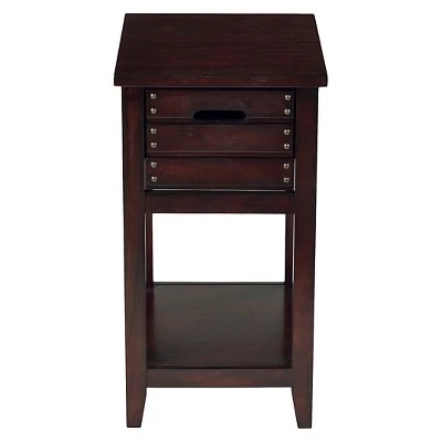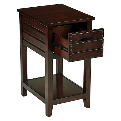 Enjoy the sophisticated charm that an OSP Designs, Camille Chair Side Table with Walnut Finish has to offer. This stunning end table has a slim design to easily slip beside your chair or couch while offering just the right amount of surface space to place your drink, remote or cell phone. The handy drawer and fixed shelf offer additional storage space. The built-in handle makes opening and closing the drawer a breeze while the wood construction enhances durability and stability. The rich walnut finish and classic nailhead accents make it a great match with contemporary or traditional dΓ©cor. End tables are a quick and easy way to add an extra touch of functional style to your living room, family room or office. Dimensions: 25.75″ H x 14″ W x 18″ D.