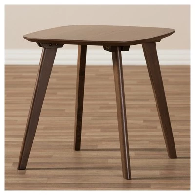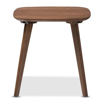 For a handsome bearing of style in your living space, opt for the practical surface area of the Dahlia mid-century modern end table. Constructed of solid rubberwood frame for strength and sturdy quality with a resilient walnut veneer wood grain for looks to last, the Dahlia end table features engineered joints for reinforcement and stability. The tabletop is great for displaying a vase of flowers or some photographs. Sleek design with tapered legs and Scandinavian-inspired, mid-century style-lines for contemporary looks. Dark walnut tone for a rich feel in your interior aesthetic with the handsome wood veneer. Brings practical surface space and Scandinavian style to your entrance or living room with the Dahlia end table. Made in Malaysia, the Dahlia requires assembly.