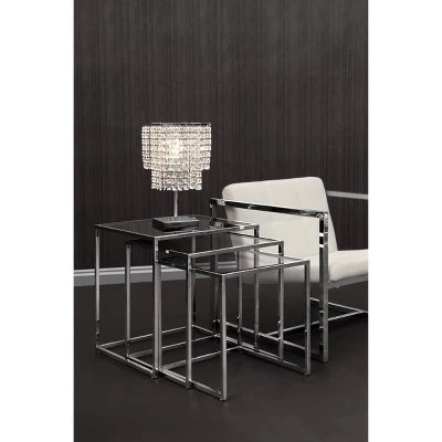 Like any nesting table, the possibilities are endless with the Pasos. It can be used in any space and in a multitude of ways. It is made of a chrome steel tube frame and with clear or black tempered glass.