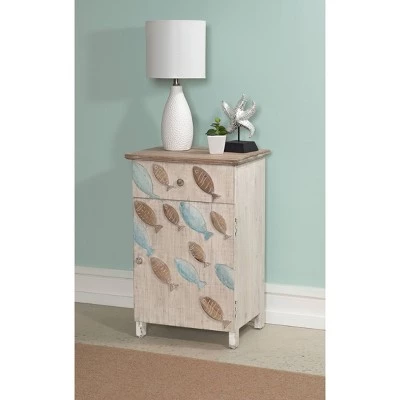 Unique coastal storage side table featuring a school of fish depicted in both carved 3D wood forms and hand painted versions. An overall ocean weathered, whitewash and natural look provide a found treasure feel. Features a slide out drawer for storing remotes or controllers. A door opens below to revel a large storage area. Arrives fully assembled and ready to add to your bedroom, kid’s room, living or family room. Ideal for a beach cottage or coastal themed room.