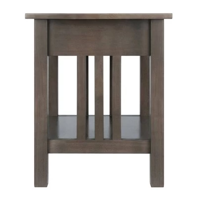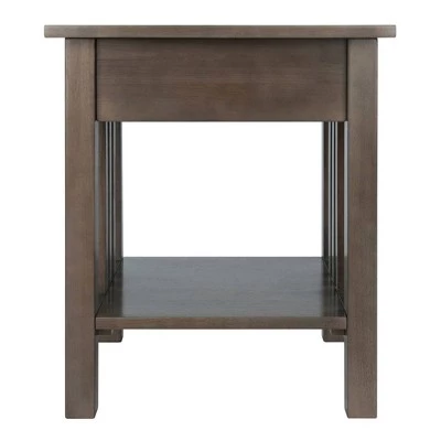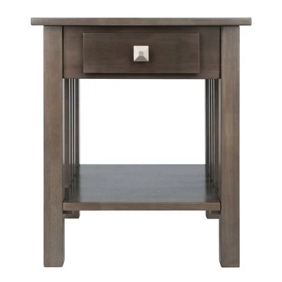 A handsome blend of classic and contemporary styling enables the Winsome Wood Stafford End Table to complement any decor. The mission-like slatted side panels create an open feel while the oyster gray finish gives it a modern touch. Featuring one drawer making this accent table just right by your bedside for a reading lamp, storing small personal accessories out of sight, yet within easy reach for your convenience. The drawer is tastefully accented with a beveled silver-finish pull. An open lower shelf is ideal for keeping books and magazines. Use this all-around end table in the living room next to the sofa or a printer stand in your home office. For larger beds, sofas or rooms, try adding one accent table on each end and coordinate with other furnishings from the Winsome Stafford collection for a cohesive look throughout your home (each sold separately). Solid and composite wood construction for long-lasting beauty and durability. Conveniently packed and shipped in 1 box that includes the hardware necessary for assembling. Replacement part request can be submitted directly to the manufacturer within 60 days from date of purchase.