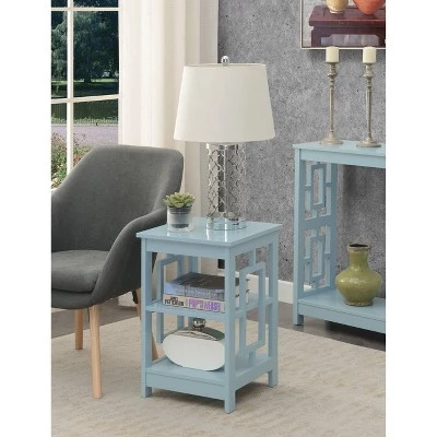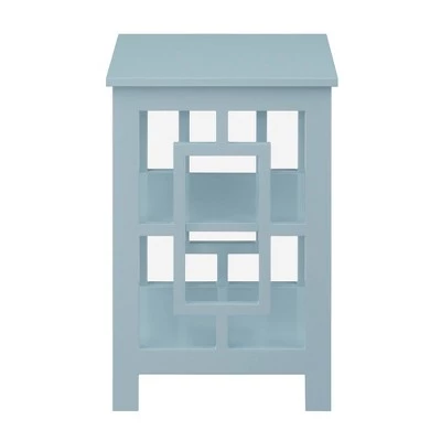 Reinvent your living room with the Town Square End Table with Shelves by Breighton Home. This simple yet eye-catching end table showcases an Asian-inspired design with its unique square side panels. Two additional shelves provide convenient storage or display space to meet oneβs entertainment and storage needs. This carefully crafted unit is constructed from MDF and finished with non-lead-based paint for safe, long-term use. Coordinate this end table with additional pieces from the Town Square Collection by Breighton Home, each sold separately.