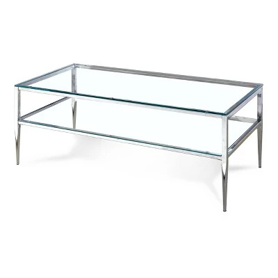 The HOMES: Inside + Out 3pc Aubrey Modern Table Set with Stiletto Legs in Chrome offers a chic twist on a classic design that you’re sure to love! The slim bases crafted from durable metal boast a shiny metallic finish that stylishly supports dual 8mm tempered glass shelves, both complete with smooth beveled edges. The HOMES: Inside + Out Aubrey Modern End Table with Stiletto Legs in Chrome is available in two finishes to perfectly fit your decorating needs.