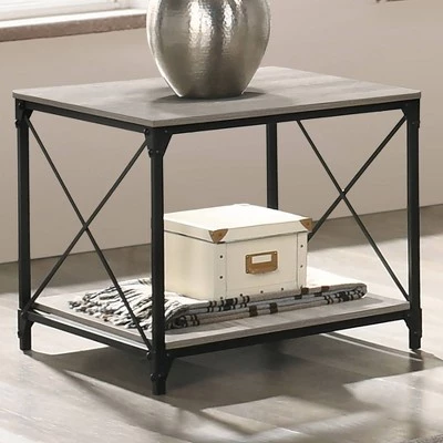 Give your living room or den a combination industrial-rustic appeal with this transitional three-piece living room set featuring coffee table and two end tables. Each piece features a rectangular top in a gray finish with rustic wood grain details, with a metal frame and legs highlighted by an X-cross side design. The tables also come with an open bottom shelf for convenience and rivet details at the corners for rugged style.