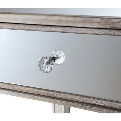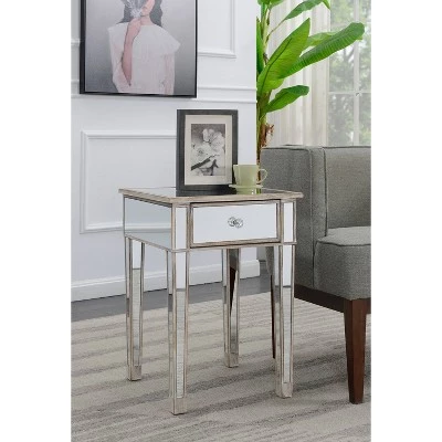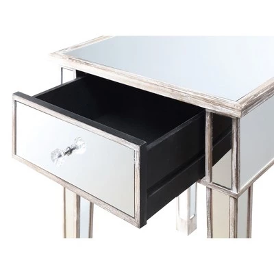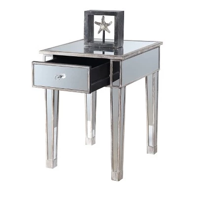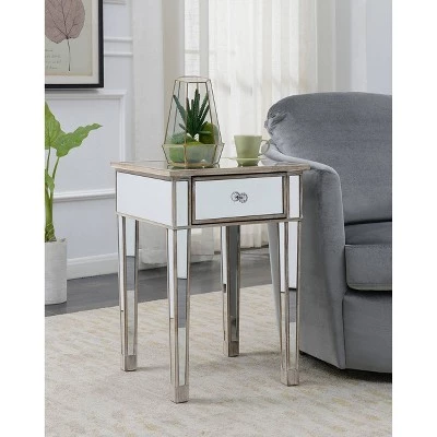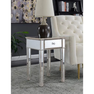 The classy yet contemporary styling of the Gold Coast Mirrored End Table with Drawer will bring new life to any space. The glass mirror inlay pairs perfectly with the fir wood base. The faux crystal drawer pulls bring the look together giving you access to the drawer providing concealed storage. Look for other pieces from the Gold Coast Collection sold separately.