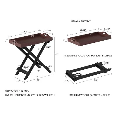 - Dimensions: Overall: (L) 22″ x (W) 12.5″ x (H) 23″; Tray Top: (L) 21.62″ x (W) 13.75″ x (H) 3″; Folded: (L) 12.5″ x (W) 2.5″ x (H) 30″