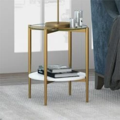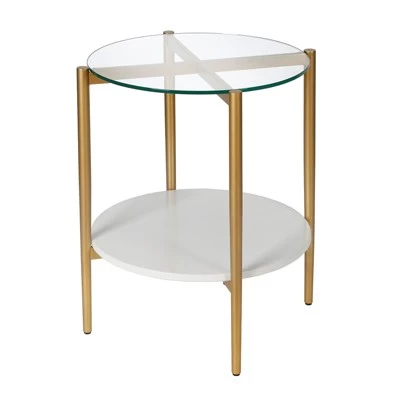 This mid-century inspired side table is the perfect pick for your living room or den ensemble. Its base features four tapered legs connected at the center. The top is a transparent tempered glass which shows off the architectural connection and carries the rectangular design through the frame. The lower shelf is made in a shiny white lacquer, playing off the tempered glass in shape and sheen. It’s finished in gold making it classic and neutral enough to work in any space.Features : Hand crafted gold finish is applied to the steel frame. Tempered glass top and white lacquer shelf.Clean with a soft, dry cloth; no harsh chemicals or abrasive cleaning materials.Features easy assembly.Weight capacity can support up to 40 LBS.Premium materials have been used in the making of this productSpecifications : Product Weight : 16.7 lbsFrame Material : Metal