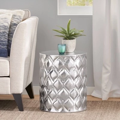 Set the stage of your interior space with an accessory of unparalleled aesthetics. Featuring a gorgeous ikat-patterned exterior with a polished metallic finish, our handcrafted side table is the perfect accent piece for any space and can hold a lively lamp or a tray of snacks with ease. Its understated cylinder silhouette, durable aluminum structure, and carefully hand-crafted details enhance the look of your home in an instant. Finished with a stunning textured finish, this refined table is the perfect addition to any space.