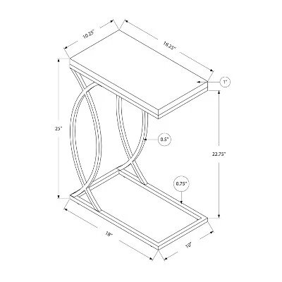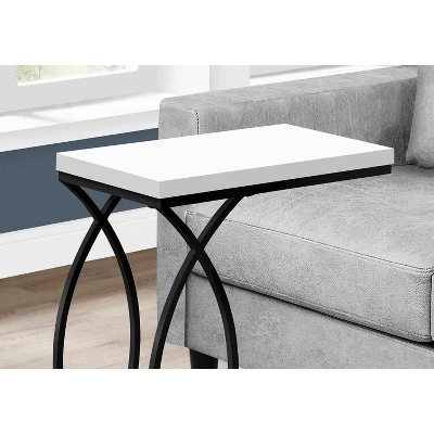 Pass the popcorn no more with this 24.5-Inch C Shaped Accent Table from Monarch Specialties that handily keeps snacks within arm’s reach while you watch TV. With a C-shaped metal frame, this accent table features a base designed to be placed under furniture, bringing the tabletop surface closer to you when seated. Featuring an interesting circle design, this stylish table can easily slide around couch arms and beds for an extra surface at arm’s reach. Whether used in a living room or bedroom this versatile accent table is a great choice for rooms with limited space. Finished on all sides, it can be positioned with either side facing forward.Small in size yet big in functionality, this table is a lightweight 8 pounds, so you can easily carry it to wherever you need a space-saving end table with style. With its laminated top in an elegant, white finish and sturdy metal frame in black, this 24.5-Inch C Shaped Accent Table from Monarch Specialties will bring a clean, modern look to any room.