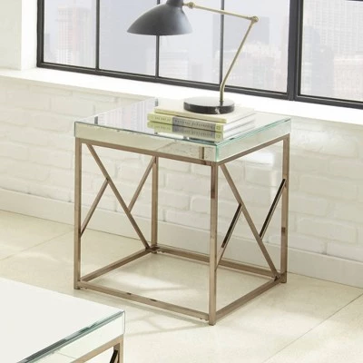 Designed with a chrome-finished frame and a pristine glass tabletop surface, this Evelyn End Table from Steve Silver Co. keeps drinks, remotes and more close by. This square end table features a sleek contemporary silhouette that is perfect for any space, modern or classic, while the copper finish adds to the glamorous look.