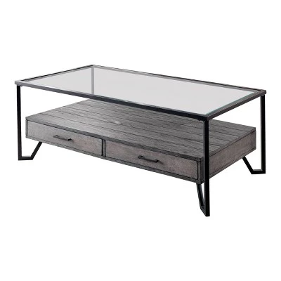 Mingling Industrial and Contemporary Farmhouse design elements, this two-piece accent table set features a mixed material wood and metal construction. The set is highlighted with two-tone gray and black finishes, trending in the current interior design world. Each table is topped with a clear glass tabletop and includes a storage drawer case underneath that appears to float on hairpin metal legs.