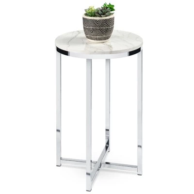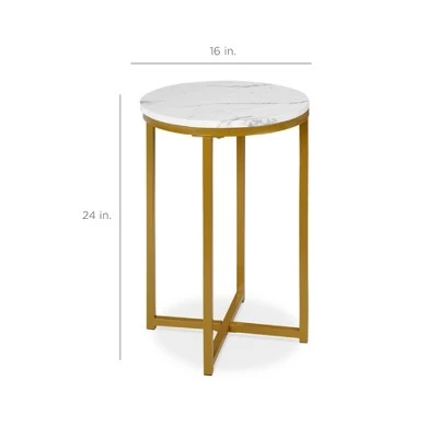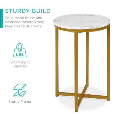Stylish yet subtle home furniture is essential to the space-saving interior decorator This accent table is carefully crafted with a round, marble tabletop over a bronze-finished metal frame to add elegant charm to any space. The solid metal frame and balanced table top help keep this table sturdy and support a 55lb weight capacity. Aside from the sturdy frame, this piece has a 16in. diameter table top! The table’s smooth frame and faux-marble surface make for an easy-to-clean table that can be wiped in seconds. Finally, protective plastic feet (foot sliders) help prevent the table from scratching your floors. If you need a tasteful, compact, and scratch-resistant table, then look no further!