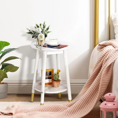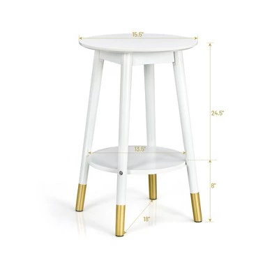 This end table features 2-tier open shelves, which makes it the perfect place to put a variety of items. Made of a combination of solid wood and engineered wood within a classic white finish, the table is ideal for almost any space, and it blends well with your home decors, such as the living room, bedroom, bathroom, balcony, and other places. Plus, this end table also comes with a detailed instruction, which is easy to assemble. Are you ready to say goodbye to your messy room? Our end table is a perfect storage table without occupying large space. Do not hesitate to buy it now!. Specification: Color: White. Material: Solid Wood, Engineered Wood. Product Size: 18” x 18” x 24.5” (L x W x H) . The Diameter of Table Top: 16” . The Diameter of Bottom Level: 13.5” . Weight: 9lbs . Load Capacity of Tabletop: 110 lbs. Load Capacity of Bottom Shelf: 22 lbs. Package includes: . 1 x Side Table. 1 x Accessory Bag. 1 x Instructions.
