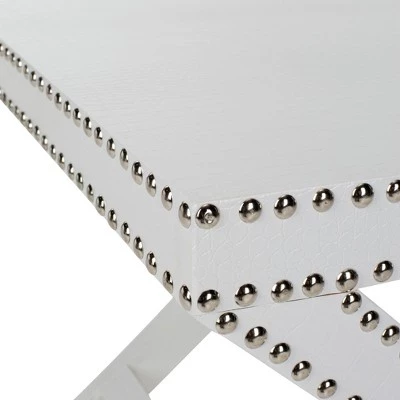 The Jeanine X Bench would feel at home among the chic dΓ©cor of a Deco Manhattan apartment as easily as a contemporary Hollywood mansion. Crafted with iron nail head detail, Jeanine is perfect for any interior that requires a glamorous finishing touch. Care Instructions: Dust regularly with a soft, dry cloth. Never use oiled or treated cloths on lacquered finishes. Some finishes can be wiped with a damp (not wet) cloth, followed at once by rubbing with a dry cloth to remove fingerprints and smudges. For persistent spots, gently clean with a soft cloth and a solution of water and mild soap, make sure to wipe dry. Use adhesive felt pads, coasters and placemats to protect your furniture.