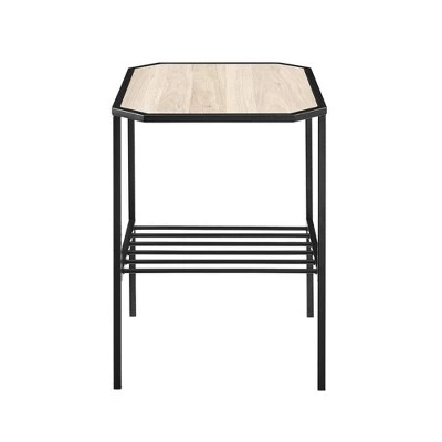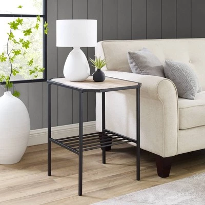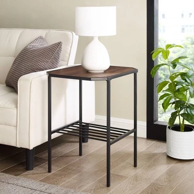 No need to cut corners around your dream interior design style, Saracina Homeβs Modern 2 Tier Chamfered Corner Side Table has already done it for you! The contemporary design and stylish chamfered corners are perfect for decorators who want to update their living room, home office, or sitting area with an effortless modern appeal. The smooth, powder-coated steel legs and bottom shelf add a touch of urban industrialism and offer additional space for your novels, ceramic collectibles, or storage bins. The accent tableβs warp-resistant MDF wood build and durable laminate coating mean you can enjoy this trendy tabletop and all its many uses for years.