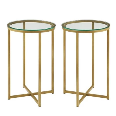 Add a splash of modern style to your living room with the Vivian Glam X-Leg Round Side Table Set by Saracina Home. Mixed materials and finishes make for an end table duo that will instantly glamourize your space, complement your décor, and set the stage for drinks and snacks. The geometric, X-style legs contrast the round top surfaces and create contemporary, harmonious silhouettes. Stylish and practical, these circular accent tables also include caps on the metal legs to protect your flooring from wear and tear. Tie the room together by pairing these pieces with Saracina Home’s matching coffee table.