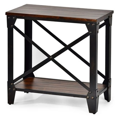Achieve a casual industrial look with the Winston Chairside End Table Rustic Cherry from Steve Silver Co. The modern design complements many types of decor. Solid birch hardwood tops and shelves are finished in a rustic medium cherry finish while the iron flat bar and French bracket framing with exposed rivets inspires an old world and eclectic look.
