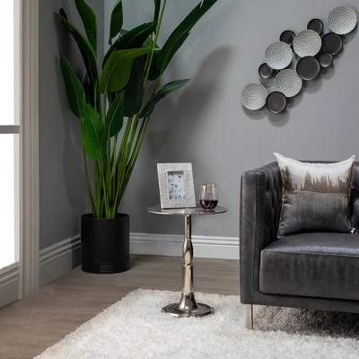 This stylish silver table is fashioned from aluminum with a pedestal style base. The base features elegant detail to up do your home style and a glossy finish for the perfect glamorous addition to any home interior. The perfect home decor accessory to accent any corner, entryway or table in your living room, bedroom, and office. Sagebrook Home has been formed from a love of design, a commitment to service and a dedication to quality. They create and import fashion forward items in the most popular design styles. Backed with years of experience in the textile field, They are now providing a complete Home decor story. the combination of wall decor, furniture, lighting and Home accessories are all coordinated with textiles to provide a complete Home look. Sagebrook Home is committed to providing the best Home dΓ©cor and accent pieces at value prices.