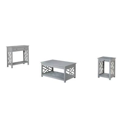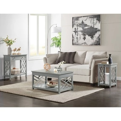 The 36″ Middlebury Coffee Table, End Table with Tray and Console Table in White from Alaterre Furniture is a great addition to your living space. The open detailing on each side is airy and offers a unique look for your dΓ©cor. The crisp white finish works well with many room color schemes. The three-table set is perfect for completing your living room. The pull-out tray in the end table is a unique way to add extra table space without taking up more floor space. The console table offers a drawer to store remotes in one place and keep them organized.