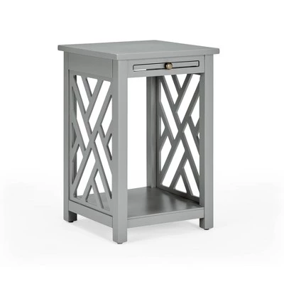 - End table dimensions: 15.75 inches W x 15.75 inches D x 23.75 inches H; shelf dimensions: 11.75 inches W x 11.75 inches D; tray shelf dimensions: 10 inches W x 11.75 inches D x .5 inches H