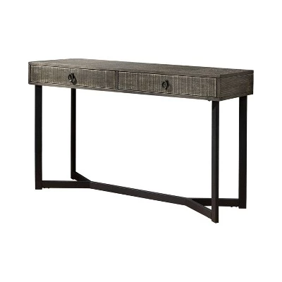 Embrace an Industrial design aesthetic with a Farmhouse touch in this charming three piece accent table set for the living room, including a coffee, console and end table. Featuring Y-style distressed gunmetal bases to provide sturdy support to the wire brushed two toned dark oak finished cabinets. Spacious drawers with matching metal ring pulls deliver eye-catching style and impressive storage.
