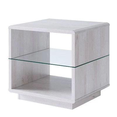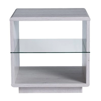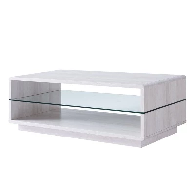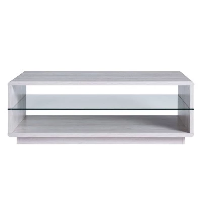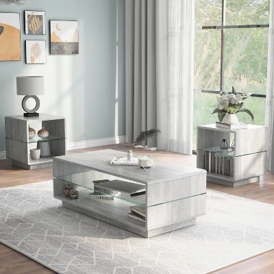 Pull together your modern living space with the clean lines and graceful curves of this three-piece contemporary living room coffee table set in white oak. Including a coffee table and two side tables, the set boasts wood grain details contrasting the crisp clarity of a single glass shelf at its center. Rounded edges soften the overall effect and a full lower shelf rests underneath the glass shelf, adding both display and organizational potential.
