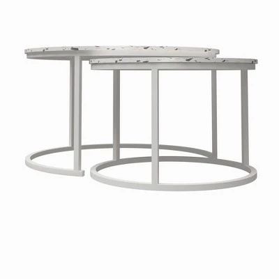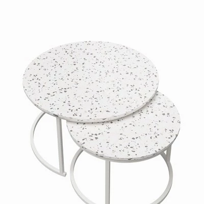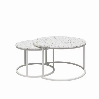 The CosmoLiving Amelia Nesting Coffee Tables are a hosting queen’s dream come true. With their space-saving design, the smaller of the pair perfectly fits under the chic coffee table to allow room for ~activities~. Pull them apart when your squad drops by for added surface space. The Amelia set is made with a sleek metal frame that pairs with the faux white marble or faux terrazzo tabletop—every fashionista’s dream. Perfect for modern and traditional style rooms. Adult ssembly required; Assembled Coffee Table dimensions: 18”H x 31.5”W x 31.5”D. Assembled small table dimensions: 13”H x 23.6”W x 23.6”D. Weight limit: 50 lbs.