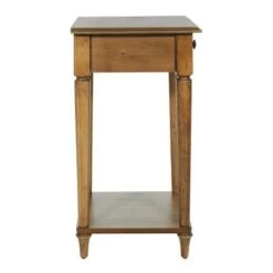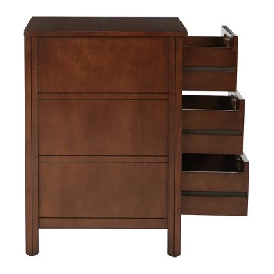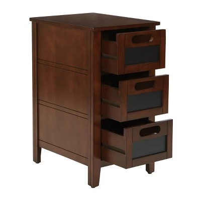 Enjoy the sophisticated charm that an OSP Designs, Avery Chair Side Table with Saddle Finish has to offer. This stunning end table has a compact design to easily slip beside your chair or couch while offering just the right amount of surface space to place your drink, remote or cell phone. The 3, handy drawers give you lots of storage space for magazines, games and more. Built-in handles make opening and closing the drawers a breeze while the wood construction enhances durability and stability. The rich finish and timeless style make it a great match with contemporary or traditional dΓ©cor. End tables are a quick and easy way to add an extra touch of functional flair to your living room, family room or office. Dimensions: 25.75″ H x 14″ W x 18″ D.
