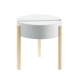The Bodfish end table is not only beautiful but multi-functional. Its neutral color palette and wooden straight-square legs make it a perfect fit for a mid-century modern aesthetic. It boasts hidden top storage. Perfect for storing all your miscellaneous items and displaying decorative pieces. Its compact design makes it ideal for smaller spaces. A matching coffee table is available.