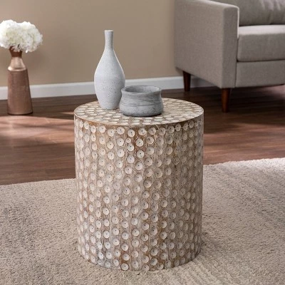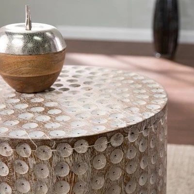 Add unique texture to your living space with the Aiden Lane Bourwiy Round Accent Table. A rustic, hand-carved pattern decorates the tabletop and sides, while the eclectic design works beautifully with your modern farmhouse or coastal dΓ©cor. Slide this side table between a pair of comfy armchairs, or tuck into your entryway to hold potted plants or your keys. Give your home a one-of-a-kind feel with this round accent table.