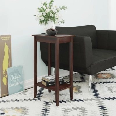 Tall, lean and lovely! DHP’s Rosewood Tall End Table brings a unique and charming design element to any room. The size of the tabletop is the perfect balance between functional and space-saving and the lower shelf provides additional space for accent pieces or other small items. Made from a combination of solid wood and wood veneer, the end table will not wobble, warp or split. Easy to assemble, this end table will be ready to decorate your room in only 15 minutes or so! Its above-average height and narrow legs make the Rosewood Tall End Table by DHP stand above all others.