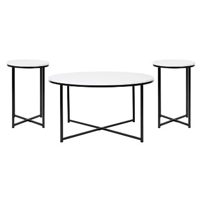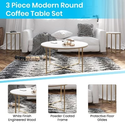 Update the atmosphere in your home with the sophisticated, polished look of this 3 piece mixed media coffee table set. Featuring white engineered wood tops, this occasional table set blends seamlessly in any space. The round shape atop modern crisscross brushed gold metal legs completes the overall look of these stunning pieces. Whether you’re serving coffee, tea, or just want a place for decorative items, you will never have to worry about the safety of these tables. The strong .5 inch thick engineered wood top stands up to daily use while the sturdy cross brace metal frames keep your possessions secure. A durable powder coated finish ensures this living room table set will look great for years to come. Have your new tables ready to use in under 30 minutes with the included step-by-step instructions and included tools. Floor glides will protect your hard flooring surfaces from scuffs and scrape and messes clean up quickly and easily with a water based cleaner. Additional Features: Cleans Easily with a Water Based Cleaner, Assembles in 30 Minutes or less for quick use, Occasional table ideal for any room in the home.