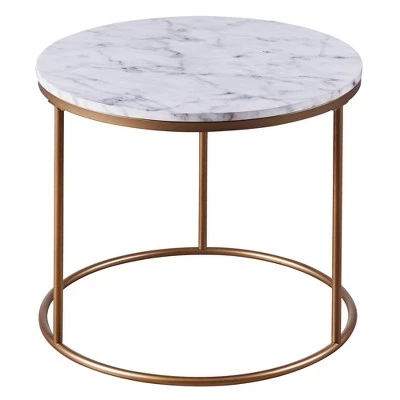- STYLE: This classic side table is a luxury addition to any house, apartment, foyer, hotel lobby or your entertainment room. Brass finish metal legs, the faux marble table top blends well with both modern and transitional styles. A hollow frame design provides a display and storage space under which is a space saver to your home.