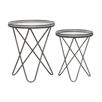 - This round glass and metal side table set features 2 pieces of elegantly crafted solid iron base and round glass surface in an industrial style inspired design
