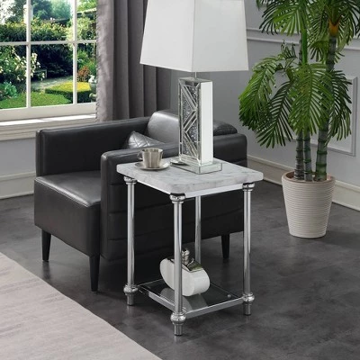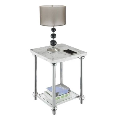 Add elegance to your living space with the Roman II End Table with Shelf by Breighton Home. The noteworthy construction was fashioned from materials that create a beautiful contrast. From the white faux marble tabletop to the clear tempered glass shelf held together by a chromed metal frame, this two tier unit will keep your guests in awe and become a staple in your home immediately. The white faux marble tabletop was made from MDF and paper with UV paint, making it glossy and easy to clean. Rest assure that the sturdy frame can hold your favorite lamp and your living room essentials. Its modern glam style will transform your home decor while keeping it in vogue. Use in your home office or den and witness its endless versatility. Bring home today and enjoy this unique piece in no time with its 5 step assembly! Ready for more? Look for the Roman II Square Coffee Table with Shelf by Breighton Home. Each sold separately.