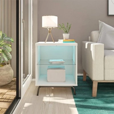 Step away from the ordinary and give your living room a modern makeover with the Room & Joy Hannaford End Table. This End Table features LED lighting with 7 different color settings for a fun and funky look for your entertainment space. But the modern touches donβt stop there. The 2 open shelves, 1 glass, can organize remotes, magazines, or other electronics so you have everything you need for family movie or game night. This Table has a mix of laminated particleboard and MDF with metal feet and tempered glass shelving. Combined together this Table makes for a very sturdy addition to your room. The Table ships flat to your door and requires assembly upon opening. Two adults are recommended to assemble. After assembly, the Table measures to be 26βH x 21βW x 19.625βD.