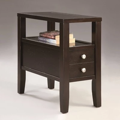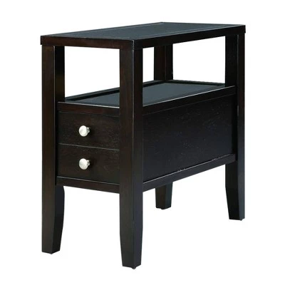 This side end table is stylishly designed to fit in any room. Its classiness and rustic appearance accents furniture and other wooden tables in the room. The weight capacity of this table is 250 lbs. for both levels. The single drawer space has a faux 2-drawer look. It has internal dimensions of 12βL x 8″W x 7 1/8″ H (24x12x9 for the external dimension of the drawer) with 6″ of space between the table top and drawer for additional storage. All parts are made from composite wood with a dark espresso finish. Some assembly required.