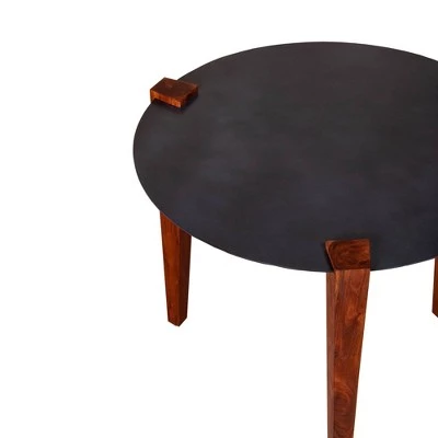 Meticulously designed, this Side Table makes a striking addition to the aesthetics of your interior. Incorporated with a round tabletop to keep your essentials handy whilst lounging on the sofa set, the Table is supported on knock down tapered tripod legs. Handcrafted from the combination of Aluminum top and acacia wood frame for lasting durability, the aesthetically visible grain details impart a natural appeal to it. Accented with a striking back powder coating, the warm brown finished legs compliment the overall look of the Table. Place it in your living space beside your sofa set or your accent chair to add a sophisticated storage space. Now keep on snacking without worrying about spills, as the tabletop can be easily cleaned with a damp cloth.
