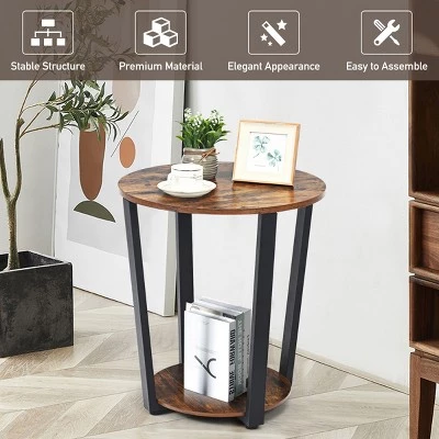 Our industrial end table is a perfect complement for your room!. Powder coated metal frame is stable and rustproof for long term use. The smooth surface with natural wood grain is waterproof and wear-resistant for practical daily use. What’s more, round shape will protect you from bruises caused by sharp corners, creating a safer environment for children to a certain extent. 2-tier storage shelves are ideal for displaying photo frame, books, tea cup or plants. It is perfect for bedroom, living room, office, etc. You can put a coffee cup on the table to enjoy leisure time.. Specification: Color: Retro Brown + Black. Material: Metal + Engineered Wood. Product Dimension: 19.5″ x 19.5″ x 22.5″(L x W x H). Bottom Shelf Diameter: 14″. Weight Capacity: 44 lbs. Net Weight: 10.5 lbs. Package includesοΌ. 1 x End Table. 1 x Instruction.