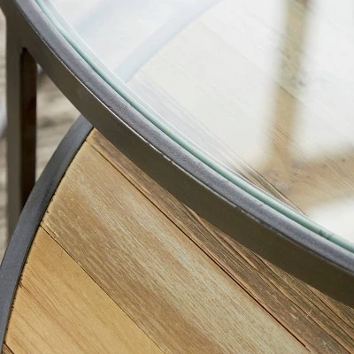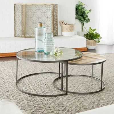 - This 2-piece contemporary style inspired gray wood, metal, and glass coffee table comes with a chevron pattern on the round surface in different shades of brown and white while the other one is topped with a clear glass surface