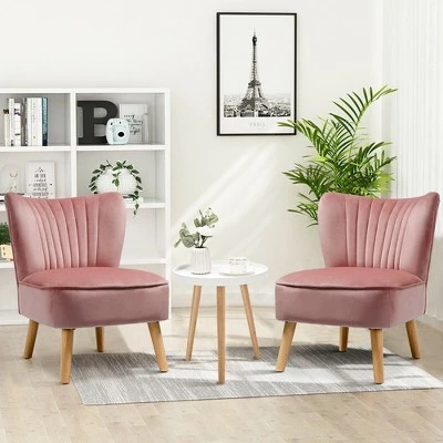 Bring a noble and luxurious look to your home with the set. Prefect for either home or workspace, the accent chair will be the highlight of your living room, bedroom, dining room and office to provide comfortable sitting experience. Crafted of rubber wood, the chair of splayed legs provides a sturdy construction and strong bearing strength. Filled with thicker sponge, the seat enables you to have a superior comfortable feeling even sitting for long time. Curved ergonomically, the wide backrest allows you to lean against it to alleviate back fatigue. Skin-Friendly velvet upholstery with high gloss and noble appearance will be certainly striking. Specification: Leisure Chair Color: Pink. Leisure Chair Material: Rubber Wood, Velvet Fabric, Sponge. Chair Dimension: 21.5” x 27” x 30.5” (L x W x H). Seat Size: 19.5” x 19.5” (L x W). Net Weight of Chair: 17 lbs. Weight Capacity of Chair: 250 lbs. Side Table Material: MDF panel, bamboo feet. Table Dimension: 16” x 16” x 17” (L x W x H). Net Weight of Table: 5 lbs. Weight Capacity of Table: 11 lbs. Package Includes:. 2 X Velvet Leisure Chair. 1 X End Table. 1 X Instruction.