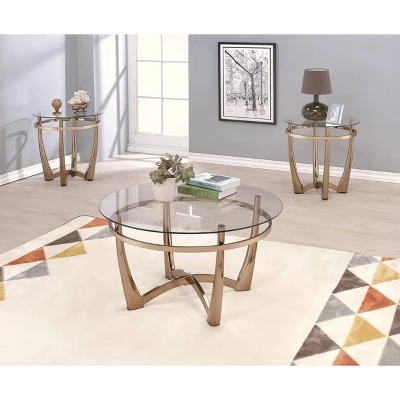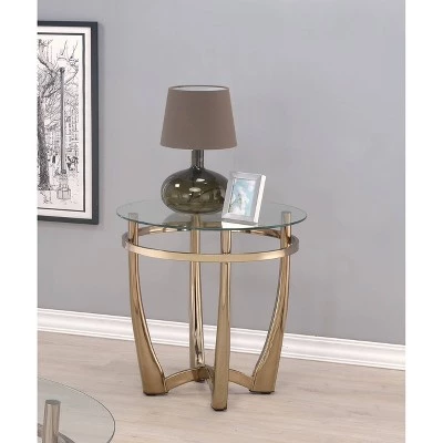 Give your space a quick style refresh with this Champagne End Table from Acme Furniture. Built with a sturdy metal frame in a unique geometric design and topped off with a gold finish, this modern end table will add the perfect finish to your decor. The round glass tabletop is perfect for displaying a beautiful lamp, your favorite houseplant or other decorative pieces.