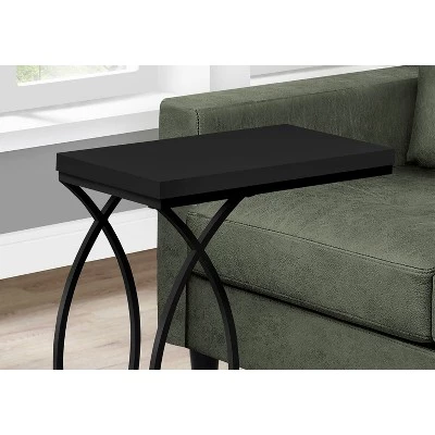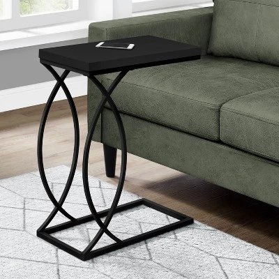 Pass the popcorn no more with this 24.5-Inch C Shaped Accent Table from Monarch Specialties that handily keeps snacks within arm’s reach while you watch TV. With a C-shaped metal frame, this accent table features a base designed to be placed under furniture, bringing the tabletop surface closer to you when seated. Featuring an interesting circle design, this stylish table can easily slide around couch arms and beds for an extra surface at arm’s reach. Whether used in a living room or bedroom this versatile accent table is a great choice for rooms with limited space. Finished on all sides, it can be positioned with either side facing forward.Small in size yet big in functionality, this table is a lightweight 8 pounds, so you can easily carry it to wherever you need a space-saving end table with style. With its laminated top in an elegant, black finish and sturdy metal coordinating frame, this 24.5-Inch C Shaped Accent Table from Monarch Specialties will bring a clean, modern look to any room.